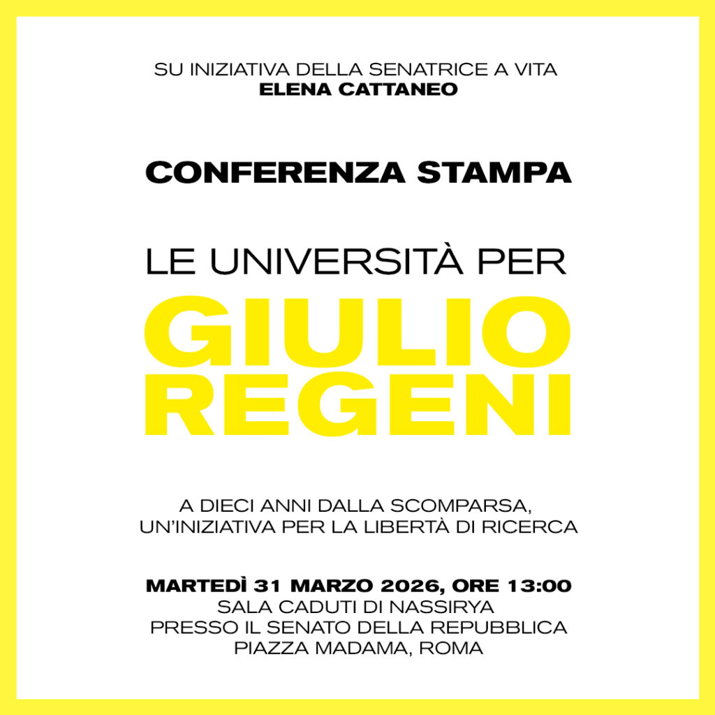 76 università, 15mila persone coinvolte per due mesi di incontri e proiezioni sulla libertà di ricerca: questa mattina, nella Sala “Caduti di Nassirya” presso il Senato della Repubblica, la Senatrice a vita e docente dell’Università Statale di Milano Elena Cattaneo ha presentato “Le Università per Giulio Regeni. A dieci anni dalla scomparsa, un’iniziativa per la libertà di ricerca”, in collaborazione con Fandango e Ganesh Produzioni.